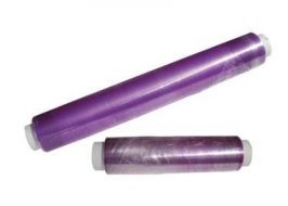 Dois rolos de película aderente plástica roxa em fundo branco